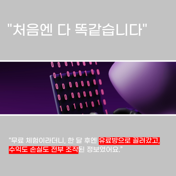 “무료 체험이라더니, 한 달 후엔 유료방으로 끌려갔고, 수익도 손실도 전부 조작된 정보였어요.”